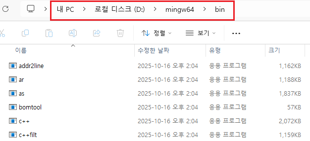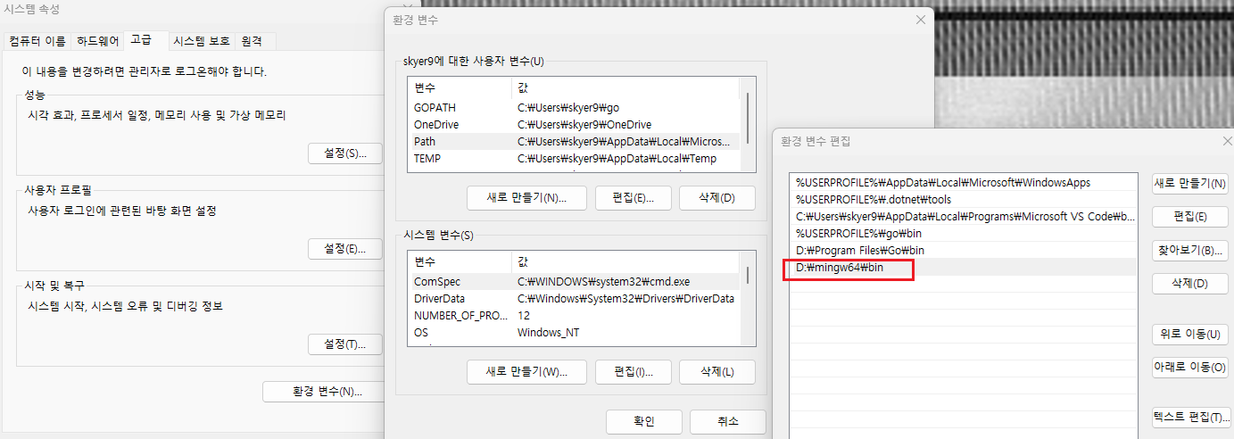만약 D:\mingw64 에 설치한 경우, 환경변수 PATH 에 D:\mingw64\bin 을 추가해 줍니다.