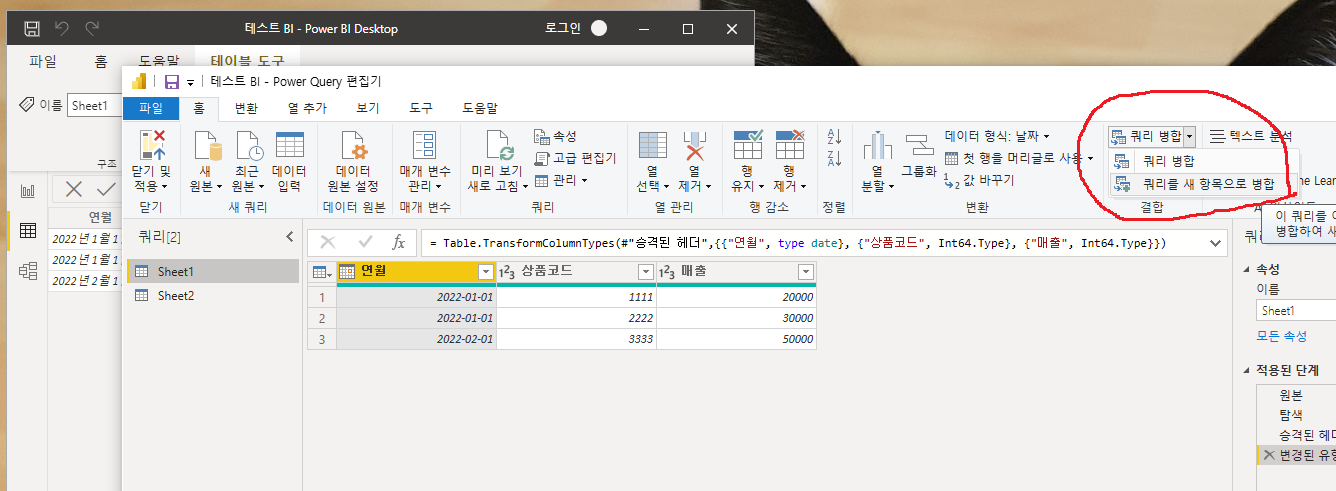 쿼리 병합 > 쿼리를 새 항목으로 병합을 선택합니다.